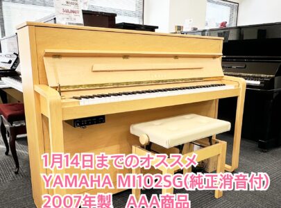 2024.1.13 Sat. 昨夜より結構な雪が降りましたね。駐車場の雪かきも終了しております! さて、本日おススメの商品! YAMAHA MI102SG(純正消音付)2007年製 594,000円税込 インテリアにピッタリな丸みのあるフォルム。消音付きで、夜の練習にも最適です。 新品同様くらい綺麗な商品ですのでお早めに… 本日も皆様のお越しを心よりお待ち致しております。